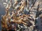 L’homme à la théière pourrait évoquer un gardien de traditions, un porteur de sagesse issu d’un monde ancien ou nomade. Le brassage de textures rappelle le mouvement des éléments — vent, eau, sable — comme si le temps érodait lentement les figures humaines, mais sans parvenir à les effacer tout à fait.