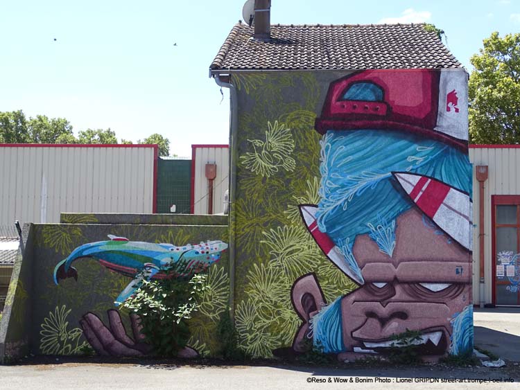- Cedric Lascours alias Reso un artiste toulousain qui provient du milieu du graffiti. Présent dans nos villes depuis plus de 20 ans, ses pièces souvent imposantes, alternent entre lettrages, personnages et scènes réalistes. Pour lui, les lettres sont colorées et s’enchevêtrent les unes aux autres.