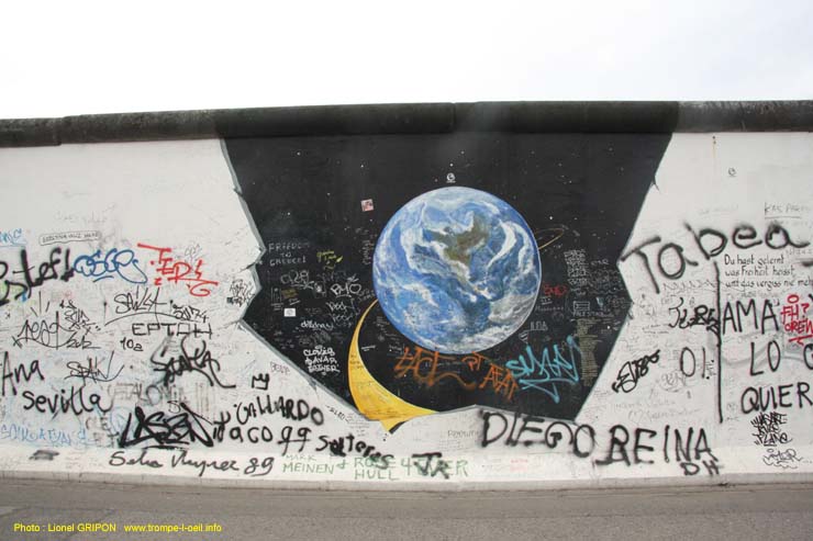 L’East Side Gallery est un morceau du Mur de Berlin, le long de la Spree, qui mesure 1.3 km de long et qui sert de support à une exposition d’oeuvres d’art en plein air et accessible à tous. Elle est constituée d’une centaine de peintures réalisées et signées par des artistes du monde entier (118 artistes de 21 pays). Les premières oeuvres ont été réalisées un an après la réunification de 1989 sur le côté est jusque là inaccessible (clichés du 28/04/2013).