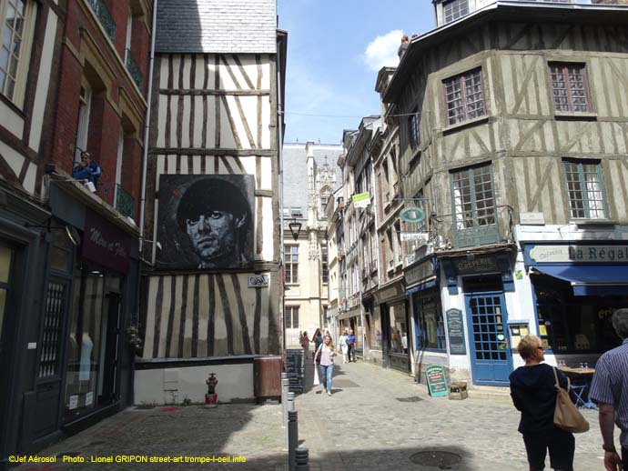 Jef Aérosol a réalisé le portrait de Dominique Laboubée (1957-2002) qui était le chanteur, auteur, compositeur leader et fondateur des Dogs, un groupe de rock rouennais. Dominique Laboubée est mort le 9 octobre 2002 d'un cancer lors d'une tournée aux Etats-Unis. La place où se trouve ce portrait porte son nom (clichés du 15/07/2016)