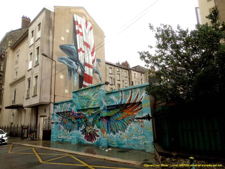 Nevercrew est un duo d’artistes suisses composé de Christian Rebecchi & Pablo Togni. Ils travaillent ensemble depuis 1996 et les sujets qu’ils traitent dans leurs fresques sont : la condition humaine, la relation entre l'homme et la nature (et inversement), l’impact des systèmes économiques ou sociaux sur l’environnement. Ici leur réalisation est contient un message d’alerte, un message écologique : il faut sauver les baleines qui sont menacées par la pêche industrielle (clichés du 17/09/2016)