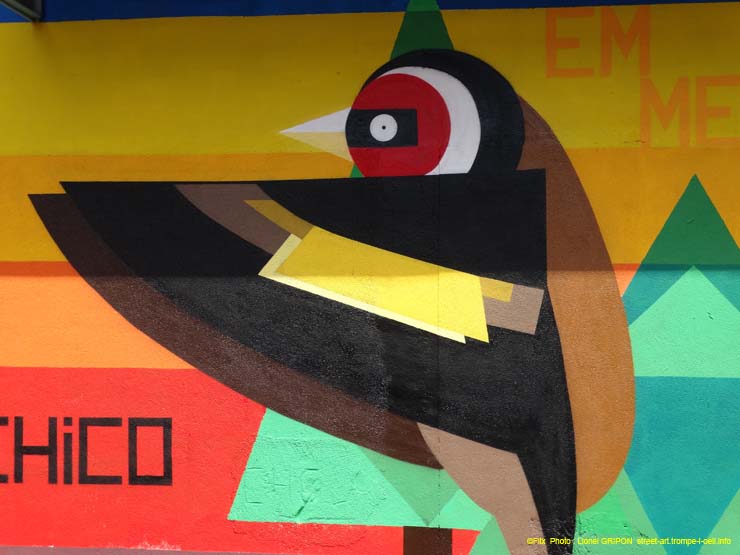 Cette fresque a été peinte en mémoire d’un certain Chico ! On peut voir deux oiseaux les ailes déployées entourés d’arbres stylisés (clichés du 20/07/2017)