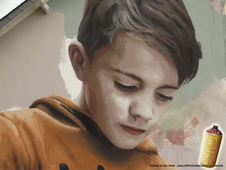 L’enfant de cette fresque est, comme les auteurs ont l’habitude de le faire, la reproduction d’une photo, comme on peut le voir sur le site des artistes (clichés du 15/07/2018).