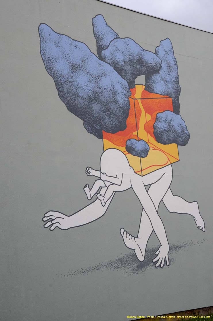 Sur le mur du groupe scolaire Colombiers, Dann Botlek un artiste hollandais nous propose une fresque surréaliste. Son univers artistique est composé de formes humanoïdes en noir et blanc. Ici son personnage est soit sur, soit sous un cube orange sur lequel des « verrues » sont attachées. Pas évident que les enfants de l’école comprennent le message, je vais les rassurer, moi non plus. Cette fresque a été réalisée dans le cadre du festival Teenage Kicks 2017 (Clichés du 07/04/2019)