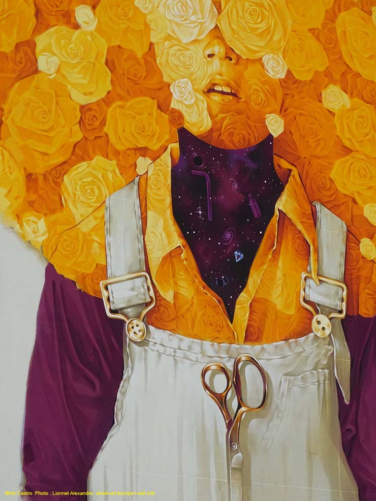 Inti Castro est un artiste chilien né en 1982 à Valparaiso qui pratique l’art du graffiti dans sa ville natale. INTI (traduisez littéralement « soleil » en langue quechua) développe un style personnel, très coloré propre à l’Amérique du Sud. Son univers pictural est festif, avec une mise en scène presque théâtrale et une symbolique empruntée à l’imaginaire populaire latino américaine. Il parsème le globe de ses fresques murales. Le « Kusillo » est son personnage fétiche, c’est une figure emblématique du Carnaval d’Ouro, un petit clown de carnaval issu de la culture bolivienne.