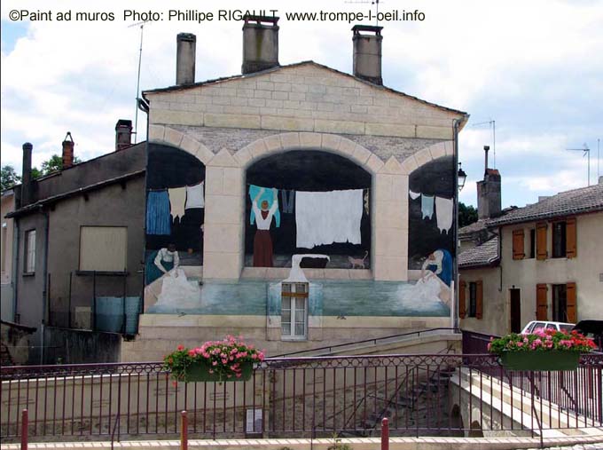 Au centre ville de Marmande, à l'emplacement d'un ancien lavoir, au bord d'un bassin en contre bas, deux lavandières s'activent toujours. Au fur et à mesure de la lessive, le linge est mis à sécher à l'abri des arcades.