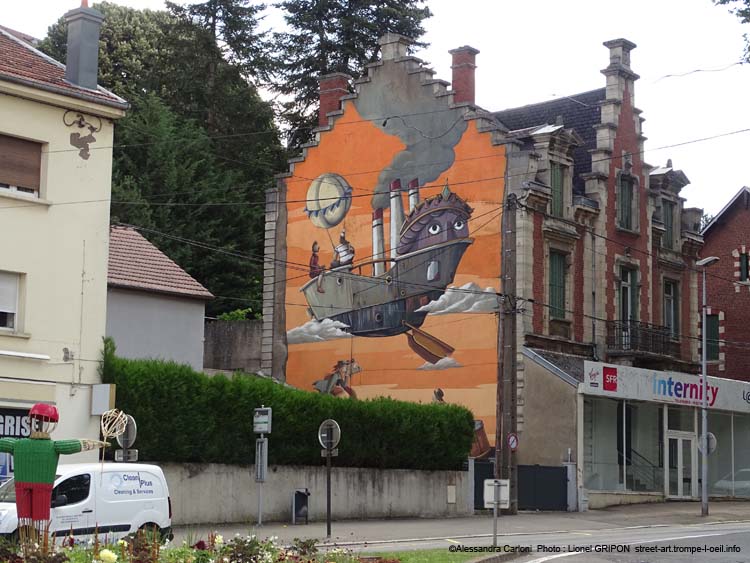 Cette fresque a été réalisée dans le cadre du festival Kufa Urba Art (le festival de street-art de la ville toute proche mais située au Luxembourg : Esch sur Alzette), et du film italien de Villerupt.