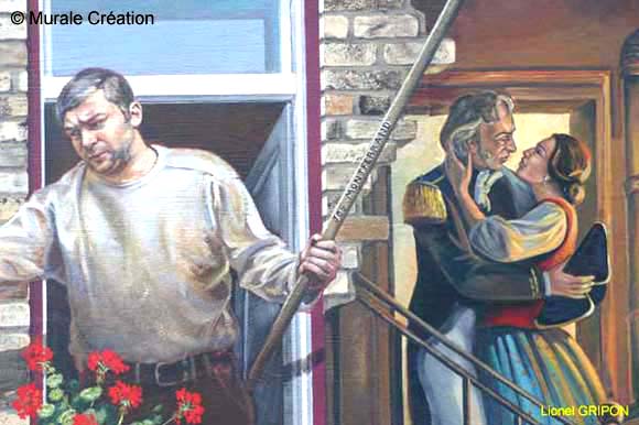 A la fenêtre, Jos Montferrand, grand défenseur des opprimés, tient à la main une sorte de harpon.. A sa droite, Lord Nelson est dans les bras de sa douce. Cet officier britannique tombé amoureux d'une québécoise fut ramené de force sur son bateau par ses marins.
