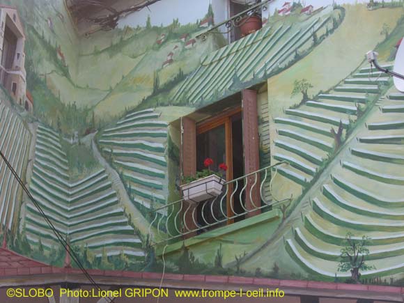 Entre la photo avant peinture (Merci Slobo) et après, ont peut observer tout le travail d’habillage de l’artiste. Une seule maison à l’origine, trois à l’arrivée après le passage de SLOBO (cherchez bien). Cette réalisation est un assemblage de fresque murale et de trompe-l’œil. Le tout en un. Du grand art. Il faut vraiment s’y reprendre à deux fois pour voir le vrai du faux (la photo avant peinture vous aidera particulièrement). Je me suis rendu spécialement sur l’endroit, et je vous assure qu’entre les photos et la réalité il y a un monde.