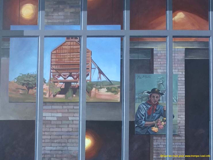 La volonté de la municipalité était d’utiliser comme thème le monde des mineurs, en s’articulant autour d’un trompe-l’œil architectural mariant modernité et mémoire.