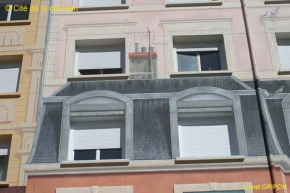Comment donner envie aux gens d’aller visiter une cité lors d’une balade du dimanche ? Et bien demandez à la cité de la création, elle a la solution. Cette cité de la ville de Lyon a été complètement réhabilitée grâce à une œuvre gigantesque. Des maisons et des petits immeubles peints sur la façade de l’immeuble, intégrant parfaitement les fenêtres existantes. Certaines fenêtres se retrouvent ainsi sous les toits (virtuels), certaines autres au milieu d’une maison particulière, d’autres au sein d’un tout petit immeuble. Le tout agrémenté de personnages, aux fenêtres, en extérieur (au bas de la façade), ou bien d’oiseaux sur les toits ou de chien dans les cours. Vraiment excellent comme approche de réhabillitation d’immeubles.