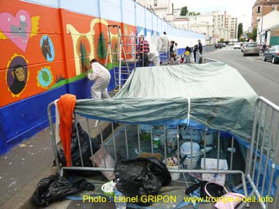 Les 200 mètres de mur de l’enclos du site ERDF de la rue Pierre Boudou d’Asnières vont être repeints par les habitants du quartier des Grésillons. La première tranche de 113 mètres a été peinte en juillet 2011 (Photos déjà en ligne). La seconde tranche de 97 mètres est en cours de réalisation.
