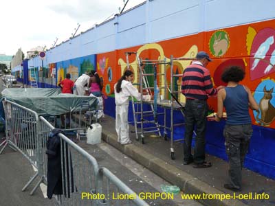 A  l'initiative du Centre Socioculturel Y. Noah, cette fresque le fruit d'un travail collectif entre les artistes Ange et Damnation et les habitants  du quartier (de 11 à 97 ans).