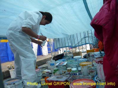 Sous la bâche, la peinture est mise à l'abri