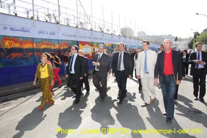 En remontant la rue, le Ministre demande à différents jeunes " et toi, as tu participé à la fresque ? oui, vient me montrer ce que tu as peint".