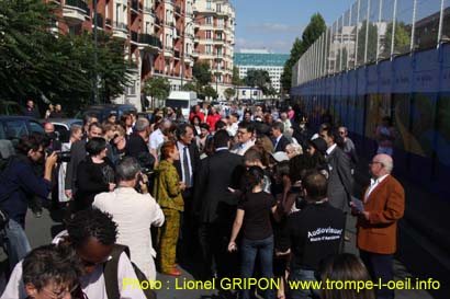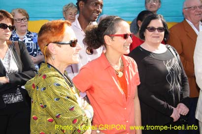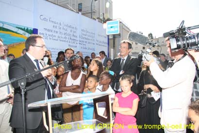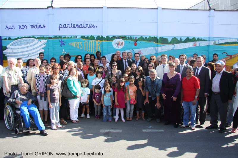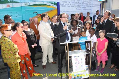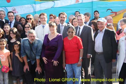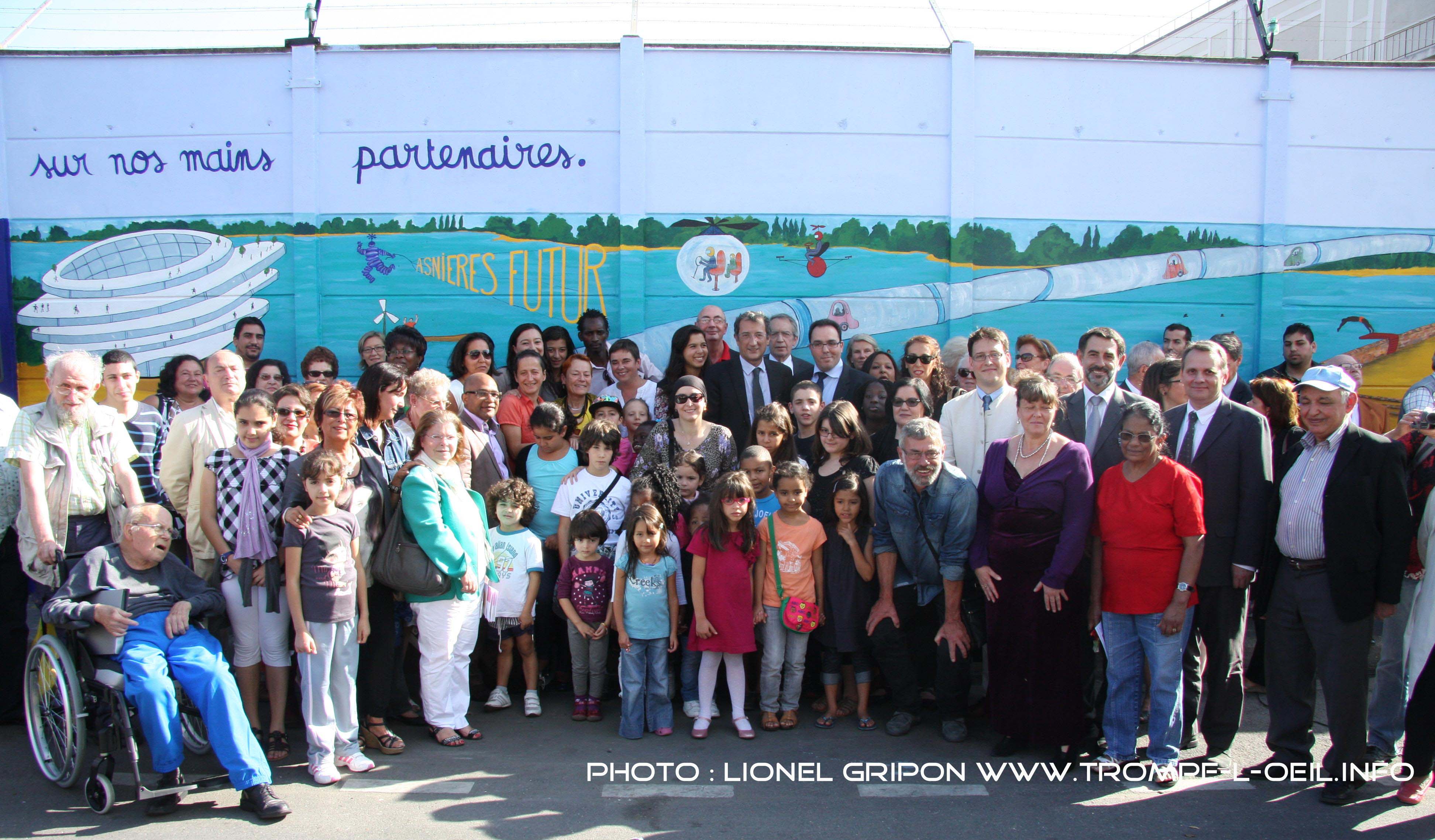 On peut voir aussi sur les clichés,  le Maire de la ville d'Asnières, Sébastien PIETRASANTA, et au centre M François LAMY Ministre de la Ville. A l'extrême droite, le président du centre socioculturel Yannick Noah qui a participé étroitement à cette réalisation.