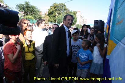 Ange et Damnation encadrant M François LAMY Ministre de la Ville. La consécration pour ces artistes, et la reconnaissance du travail social effectué auprès de la population de ce quartier.
