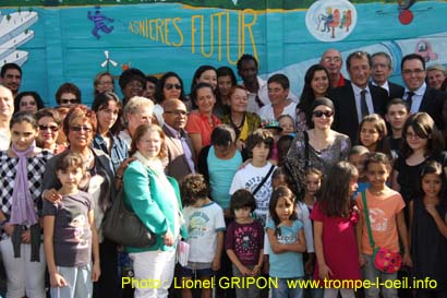 Photo de Famille : le Ministre et  le Maire d"Asnières sur Seine au beau milieu des habitants du quartier, ceux qui ont contribués à la réalisation de cette fresque.