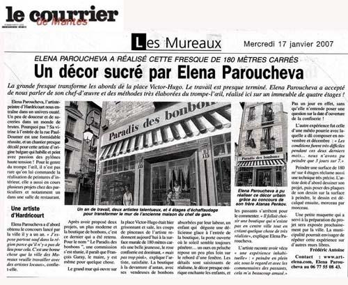 Tout le monde en parle : la grande fresque de la place Victor Hugo, non loin de la gare : un gigantesque trompe l’œil qui représente une confiserie : « le paradis des bonbons ». A l’Origine de cette œuvre , une femme, artiste d’origine bulgare qui travaille depuis des années sur le secteur des Mureaux, mais aussi dans toute la France et en Europe.