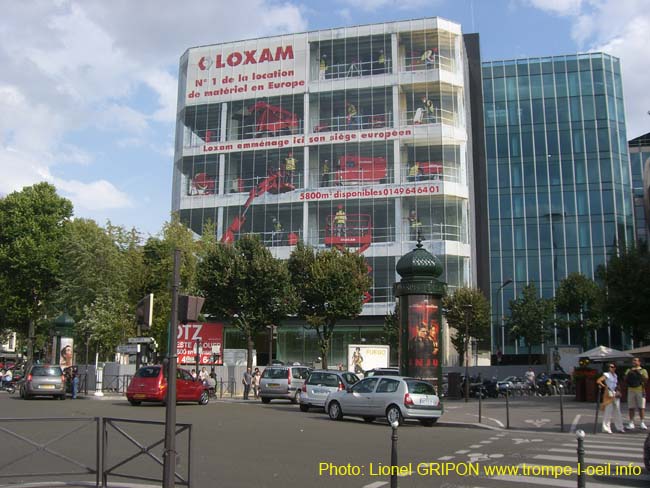 La société Loxam est en train de construire son futur siège Européen au niveau de la porte Maillot à Paris. La subtilité de cette réalisation est de nous faire « voir » les travaux qui sont en train d’être réalisés au niveau du bâtiment alors que nous n’observons en fait que l’impression numérique qui a été réalisée sur des autocollants qui sont appliqués sur les vitres (Clichés du 31 Août 2008).