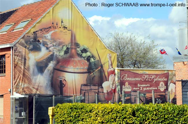 La brasserie Saint Sylvestre existe depuis longtemps, ils sont brasseurs depuis trois générations. Ils produisent les bières Trois Monts et Gavroche. Placé à l’entrée de la brasserie, cette bâche vous présente la culture de l’orge (sur la partie gauche), qui sert de base à la fabrication de ce breuvage. A coté de l’alambique des fleurs de houblons (qui donnent l’amertume à la bière). Le torrent fait allusion à l’eau qui est utilisé pour réaliser la boisson, et le moulin fait allusion à ceux que l’on peut trouver dans la région. Sur la partie droite, la touche finale du cycle de fabrication, la canette et le verre.
