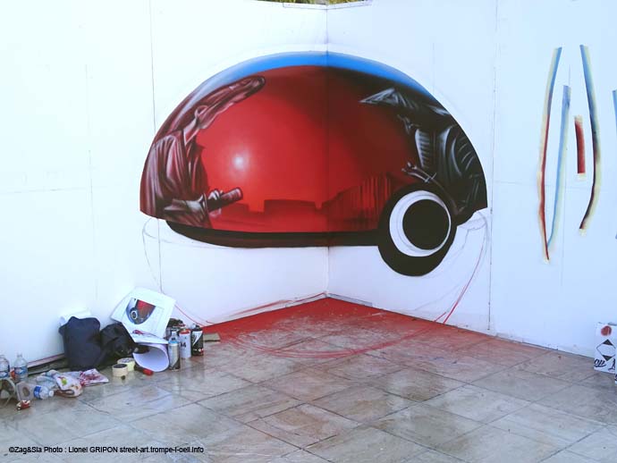 Zag et Sia sont des spécialistes d’anamorphose sur escalier. Ici il nous propose une sphère issue des jeux vidéos japonais en 3 dimensions. L’effet d’optique a été créé en peignant sur 3 surfaces différentes, les 2 panneaux à angle droit et le sol. Par contre je viens de me rendre compte que je n’ai pas pris la photo du bon endroit (pardon aux artistes) car la sphère n’est pas complètement sphérique, honte à moi (clichés 16/09/2018).