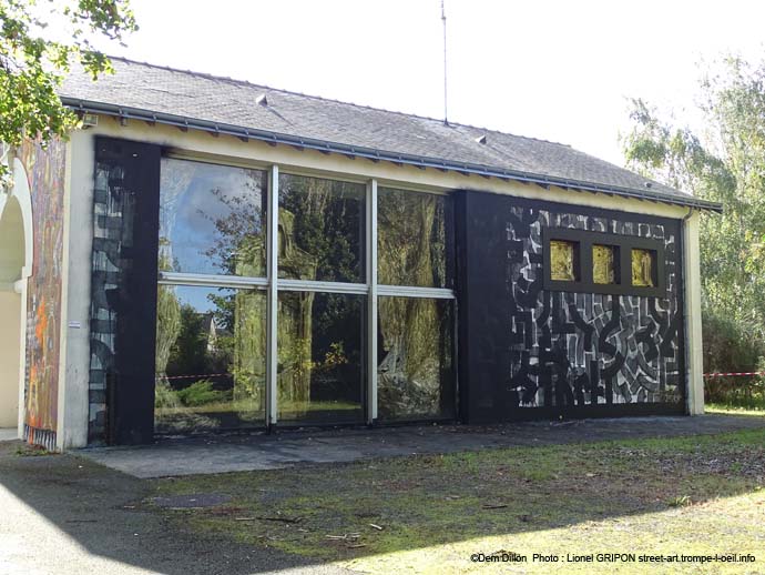Il expose son travail dans cette partie du bâtiment, on peut le voir en regardant au niveau des vitres. Son travail est centré sur la matière. Accessoirement il en a profité pour peindre le mur, mais ce n’est son habitude, c’est un sculpteur (Clichés Oct 2019).