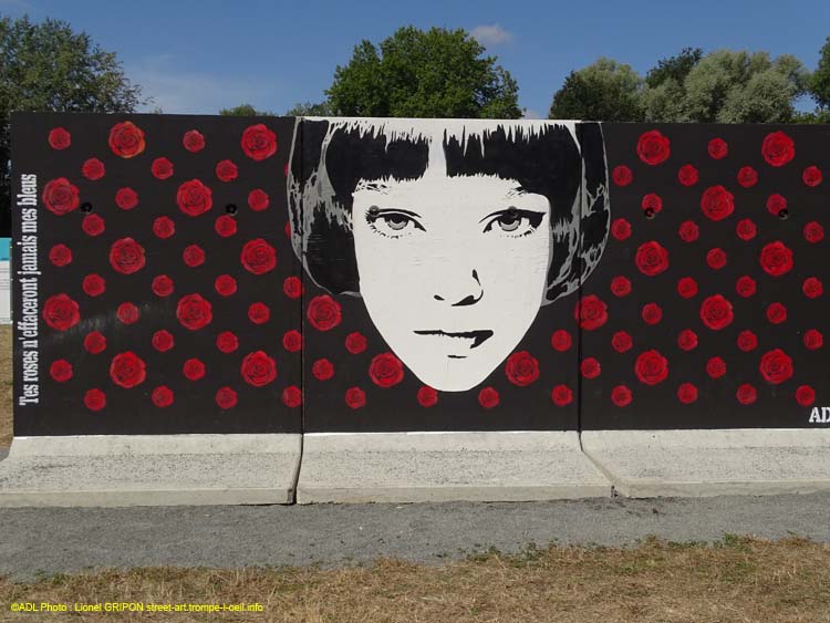 ADL (lire Adèle) est une artiste mancelle, avec son frère Lapin Blanc , ils sont les invités locaux. Adèle est une artiste touche-à-tout : passée par les Beaux-arts du Mans et une école de mode à Rennes, elle pratique non seulement le pochoir mais également la sculpture et la linogravure. Elle dessine très souvent des femmes. Leur corps ou leur regard, qu’elle sublime avec toute sa subjectivité. Dénudées, brutes, sensuelles, ses silhouettes se dévoilent sans détours