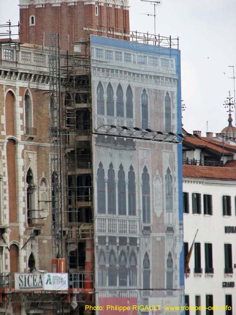 De nombreux palais ou bâtiments de Venise sont au bord de la décrépitude. Un effort de rénovation et de ravalement est en cours. Les travaux sont généralement masqués par de bâches représentant sommairement, en trompe l'œil, le bâtiment en réfection.