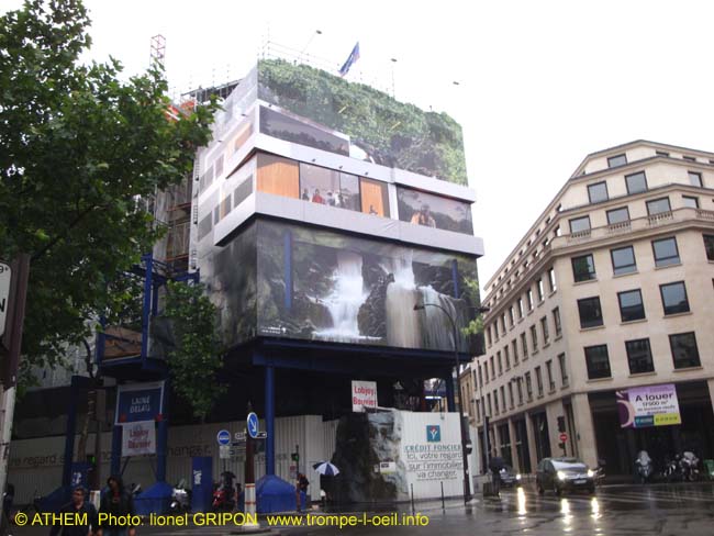 Pour masquer les travaux de cet immeuble, une bâche a été appliquée sur les échafaudages. Maintenant une magnifique cascade s’écoule en passant sous une passerelle se trouve des personnages. Sur la partie haute, une forêt apporte de la verdure dans une rue passante de Paris (clichés du 1/06/2010).