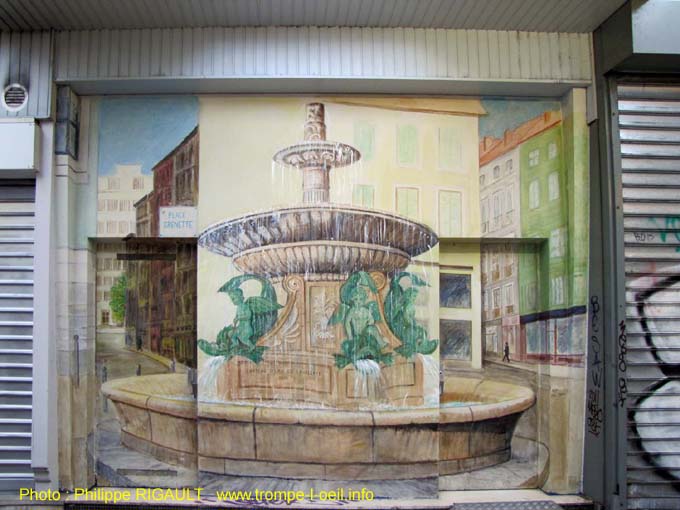 La place Grenette est toute proche de la Galerie Sainte Claire ; au centre de cette place se trouve un "château d'eau" (ou fontaine) dû au sculpteur Nardon et reproduit sur cette fresque. Cette fontaine porte en fait le nom du Marquis de Lavalette qui fut maire de Grenoble au XIXe siècle et initiateur du premier réseau de canalisation des fontaines publiques de la ville. En 1825 on érigea le château d'eau Lavalette sur la place Grenette, jadis place du vieux marché aux grains (la granaterie) d'où son nom de Grenette. M. Gaymar en fut l'architecte, il éleva ce château d'eau sur l'emplacement d'une pompe comme il en existait au XVIIIe siècle, en reconnaissance du marquis de Lavalette, ancien maire et créateur des fontaines publiques.