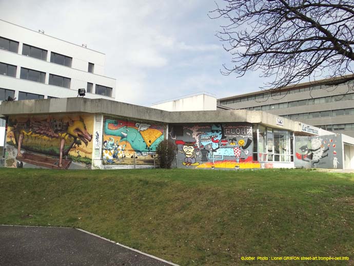 L’université de Nanterre compte de nombreuses fresques de street-art peintes en 2018. Dans le passé la Cafétéria avait déjà servi de support aux street-artists.