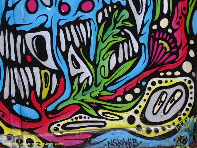 La couleur est primordiale dans ses fresques murales puisqu' elle compose l'organisme graphique de celle-ci ; les couleurs s'opposent, se superposent ou se marient entre elles. Le choix des couleurs est une composition unique, réalisée instinctivement sur un instant T, selon l’humeur du jour (clichés du 6/10/2018).