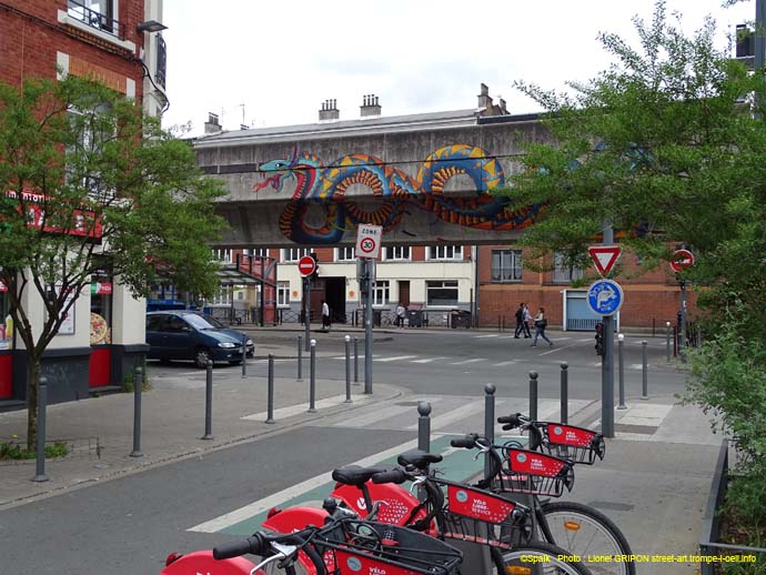 A l’occasion de la 4ème édition de la Biennale Internationale d’Art Mural (BIAM#4 – 8 Avril au 8 juin 2019) organisée par l’association Collectif Renart , Spaïk a métamorphosé les éléments de bétons qui composent la partie aérienne du métro de Lille.
