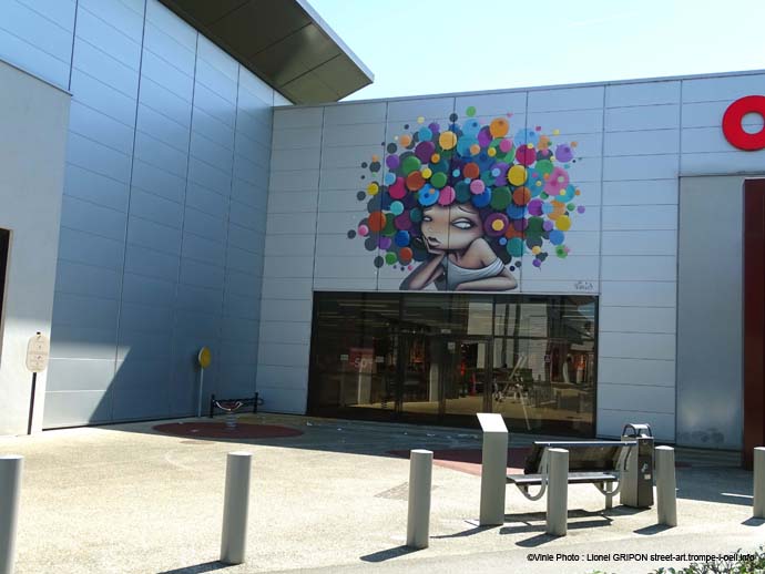 Le parc commercial du Clos du Chêne compte 60 magasins et restaurants. Il est situé juste à coté de Disneyland Paris. C’est un parc gigantesque, un centre ville nouveau, dans une ville nouvelle, pratiquement en pleine campagne. Alors pour créer une attractivité supplémentaire, 21 fresques ont été peintes par 12 artistes, certains en ont donc peint deux.