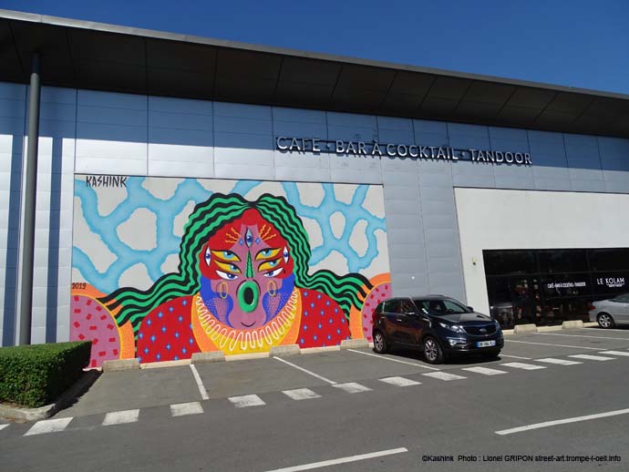 Kashink est l’une des rares femmes très actives dans le mouvement street art/graff parisien. Elle peint d’immenses personnages protéiformes aux yeux multiples, ou des têtes de mort à la mexicaine, le tout dans un style graphique très coloré, loin des références traditionnelles du graffiti féminin.