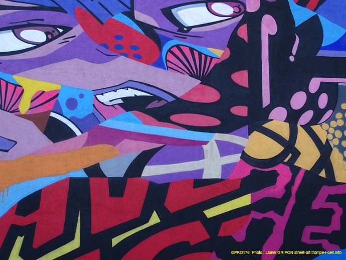 Cette fresque résume parfaitement son univers artistique, une association de couleurs vives et de portraits imbriqués dans l’ensemble (clichés du 02/06/2019).