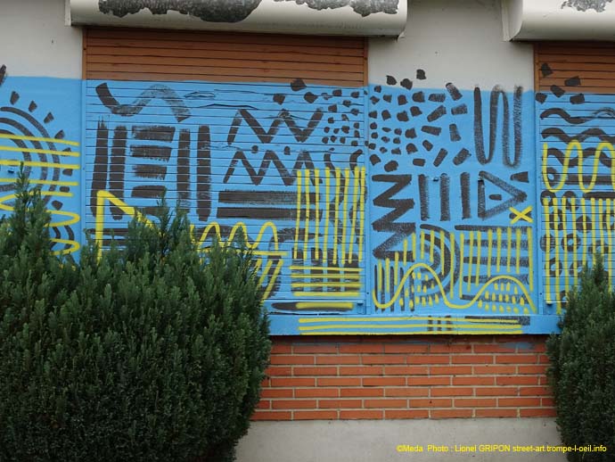 Peintre mais également jardinier professionnel, Meda réalise des créations colorés en lien avec la sculpture paysagère. A l’entrée de la Maison des Enfants de Lomme il a peint les façades de deux petits bâtiments qui se font face avec des motifs abstraits et colorés. Premières réalisations de l’artiste, cela demande à être travaillé un peu (clichés Nov 2019).