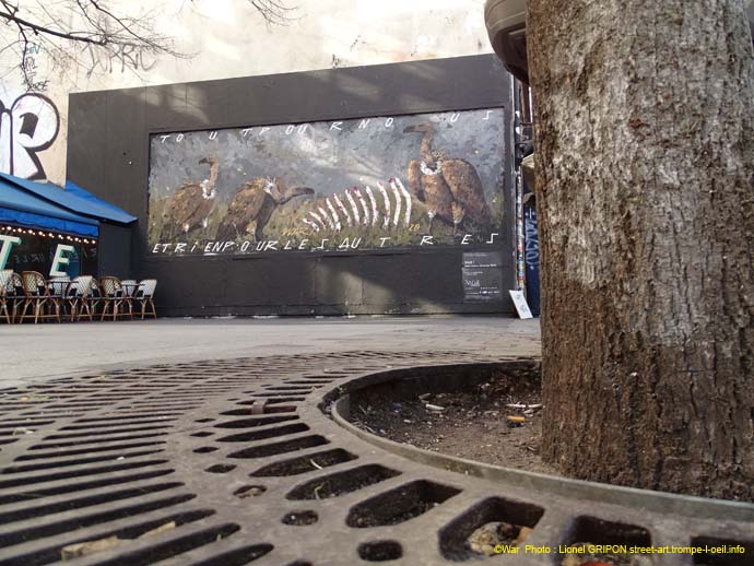 Son tableau urbain représente trois vautours autour d’une carcasse d’animal. Il ne reste plus que les os. L’artiste a écrit cette phrase « Tout pour nous, et rien pour les autres », voilà la vile maxime qui paraît avoir été, de tous les âges, celle des maîtres de l’espèce humaine (Adam SMITH, la richesse des nations, 1776) (Cliché 11/01/2020).