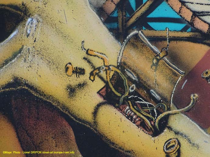 Victorien Liria, alias Maye est né à Sète en 1990. Il a commencé à peindre en 2004, passionné par le dessin, il s’exprime d’abord dans les rues de Montpellier avec le graffiti où il développe une recherche autour du lettrage. Ses décors sont habités par des personnages longilignes, souples et courbés. Leurs vêtements très détaillés laissent apparaître en partie leurs corps à demi mécaniques. A l’image de leur environnement, ces femmes et ces hommes sont composés d’éléments naturels et artificiels. L’interaction épanouie entre ces figures humaines et les animaux qui les entourent contraste avec le chaos ambiant et apporte une touche d’espoir. On retrouve cet optimisme aussi dans son utilisation de couleurs pastel, dont la chaleur et la lumière jaillissent par endroit.