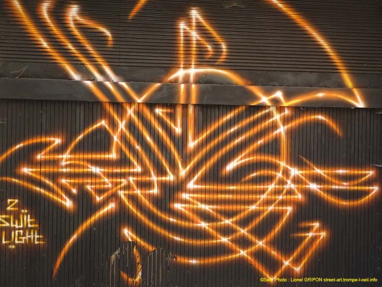 Sur cette porte de garage, Swit a peint un motif en « lightgraff » ou graffiti lumineux, le principe consiste à donner un effet de lumière à ce qui est peint. En plissant les yeux on voit mieux l’effet lumineux de cette réalisation (clichés Juillet 2020).