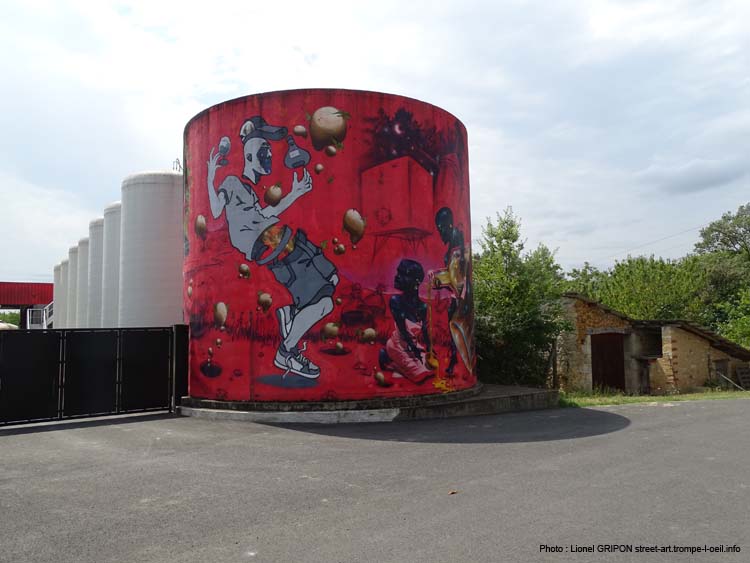 Ils ont peint une citerne des Armagnacs Delord. Une fresque circulaire qui n’est pas facile à prendre en photo. La thématique de fresque tourne autour de l’Armagnac, ce qui est normal, bouteilles, verres et alcool sont donc au rendez-vous (clichés Juillet 2020).