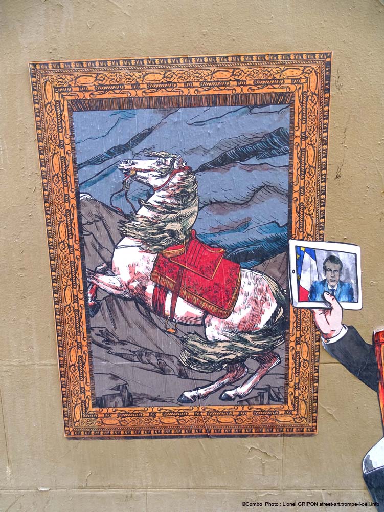 Il commente son collage avec cette phrase “Le musée du Louvre étant fermé, Napoléon ne peut plus attendre alors il communique avec Emmanuel Macron « Halo Emmanuel commentez-moi la fermeture les frontières de mon pays! Et passez moi Roselyne j'ai deux mots à lui dire !!!” (clichés Mars 2021)