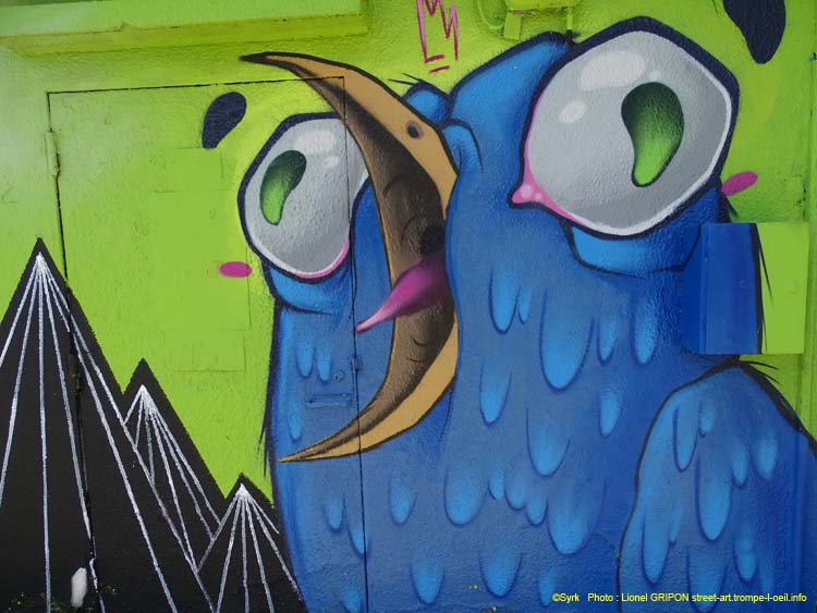 Syrk est un artiste poitevin originaire des Landes. Depuis 2004, Il est street-artist, peintre, dessinateur et iIlustrateur, son univers est très attractif, inspiré de la bande dessinée, où les animaux ont la première place. Inspiré des illustrations et de la littérature enfantine, il en garde une vision naïve, drôle et colorée, qu’il aime torturer gentiment avec beaucoup d’humour.
