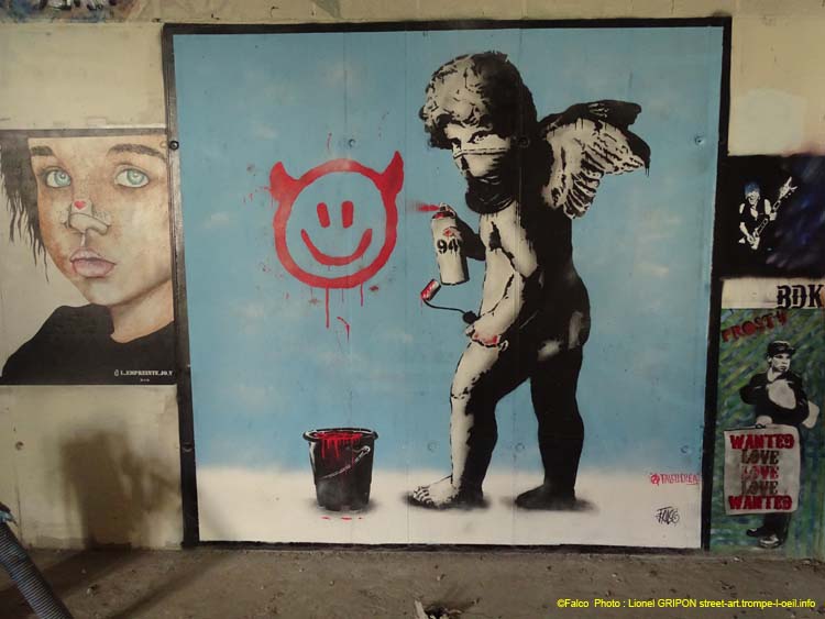 Il nous propose un ange graffeur avec un rouleau et une bombe aérosol à la main. Il vient de dessiner un diable. Il commente sa fresque avec ces morts « Parfois, il n'y a rien de mal à mettre l'ange sur votre épaule gauche en sourdine et à vous faire plaisir avec un peu de méchanceté pour vous sentir vivant. » (clichés Nov 2021).