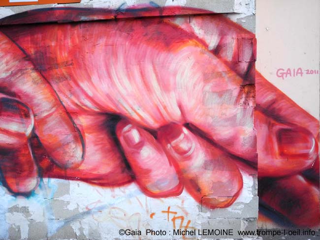 Gaia, personnification de la Terre dans la mythologie grecque, est un jeune artiste américain né à New-York. En général, il fait des collages, souvent en noir et blanc, qui représentent des animaux. Cette fois-ci, le noir et blanc s’est transformé en rouge, et le thème principal est la main.