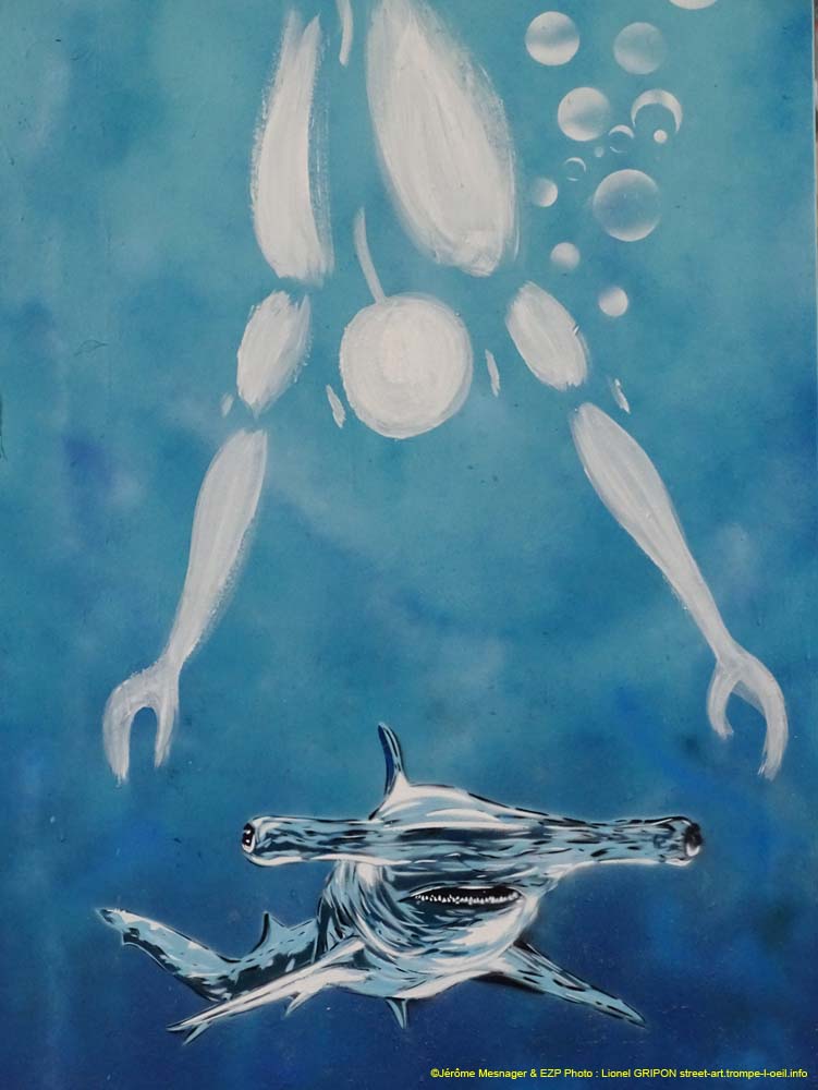 Ils ont peint plusieurs poteaux où ils nous emmènent dans les fonds marins. La silhouette de Mesnager nage au milieu des requins (Clichés Août 2022).
