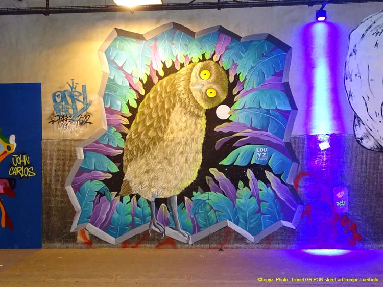 Au travers d’une trouée dans le mur (sa marque de fabrique) elle nous propose une chouette bien sympathique, qui vous regarde passer dans le tunnel, la tête penchée (clichés Août 2022).