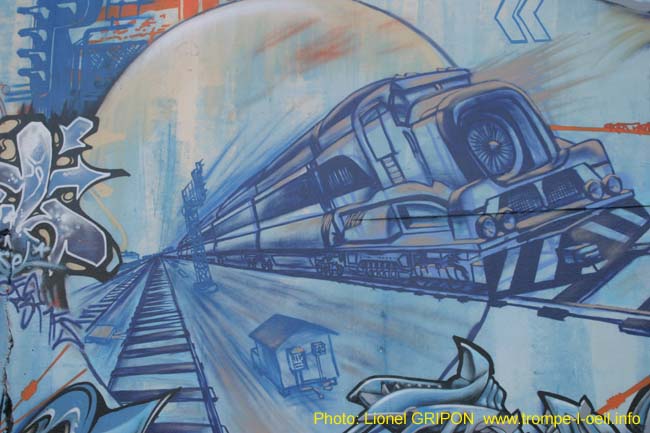Ce mur qui longe la voix de chemin de fer près de la gare de Courbevoie a servi de support à cette peinture d'inspiration ferroviaire (normal).