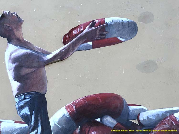 Philippe Hérard est street-artist depuis 2009. Il habite le 20ème arrondissement de Paris dans le quartier de Belleville. C’est un artiste spécialisé dans les collages. On en croise facilement dans les rues de Paris. On reconnaît aisément ses réalisations grâce à des éléments que l’on retrouve assez régulièrement : des petits bonhommes qu’il appelle « ses gugusses » et des bouées rouges et blanches (éléments qui lui plaisent visuellement). Les gugusses ou les portraits qu’il peint sont des personnages anonymes placés dans des situations absurdes ou inconfortables. Ils apparaissent entassés, tirés par des fils, piégés par des bouées etc..